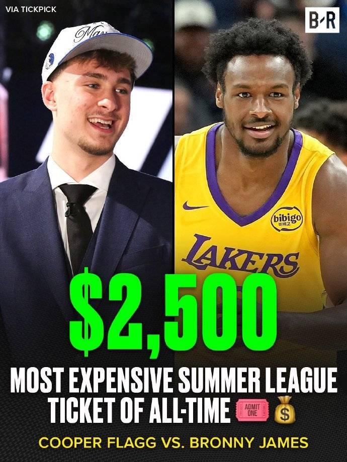 状元库珀-弗拉格将迎来NBA生涯首秀,而他的对手则是布朗尼-詹姆斯所属的湖人队。据悉,本场门票平均价格达到了200美元一张,其中一层内场门票高达650美元,场边票高达2500美元,皆创夏季联赛票价历史新高。
